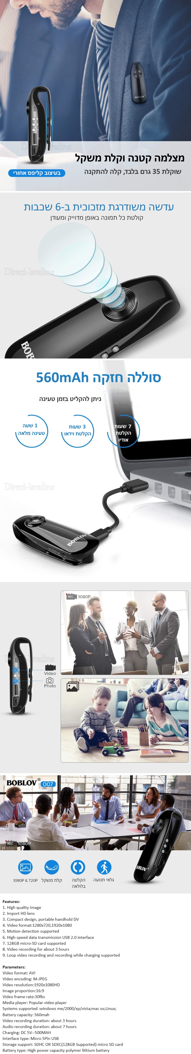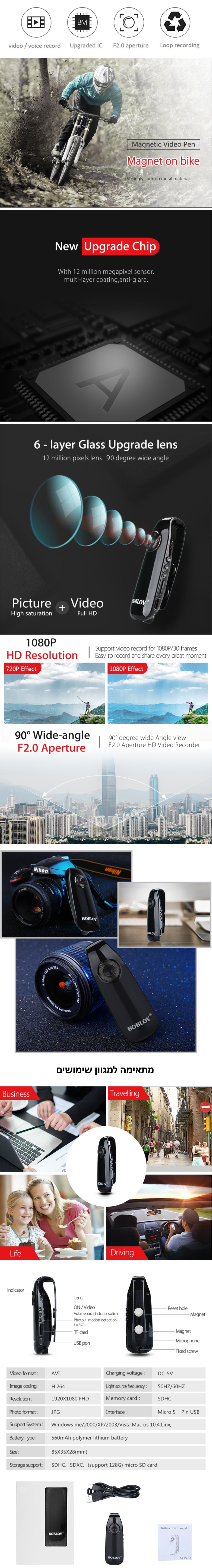 מצלמת גוף חוברת הוראות הפעלה ונתונים באנגלית - הקלק לקבצי תוכנה מאתר היצרן - הקלק המארז כולל: מצלמה, כבל טעינה וחוברת הדרכה באנגלית ניתן להוסיף כרטיס זיכרון עד 128GB בתוספת מחיר