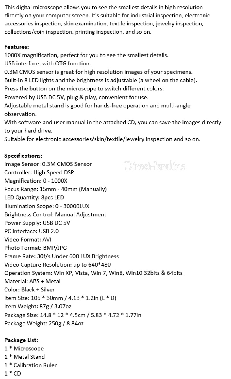 מיקרוסקופ דיגיטלי USB מגדיל פי 1000 D5190 למחשב וסמארטפון *במלאי מיידי*