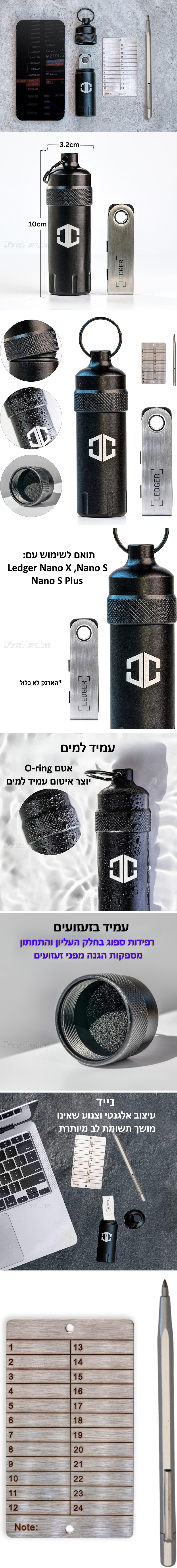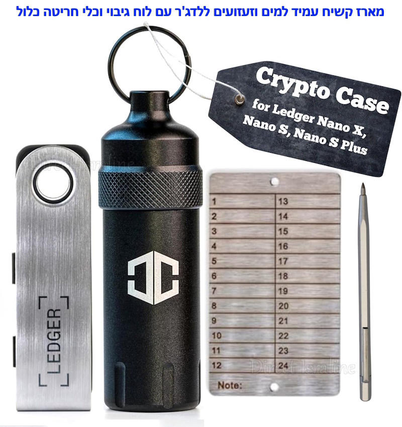 הערה: ה-Ledger עצמו אינו כלול. הערכה כוללת מארז, מחזיק מפתחות, לוח גיבוי לכל מילות ה-Seed וכלי חריטה.