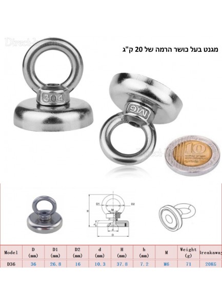 מגנט בקוטר 36 מ"מ עם טבעת אחיזה להרמה עד 20 ק"ג D36mm M6/304
