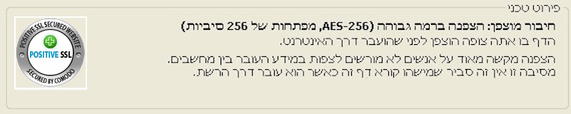 - דיירקט ישראליין - קנייה ישירה לישראל - מאבטחת את נתונייך האישיים בזמן הגלישה באתר, ברמת האבטחה הגבוהה ביותר ע"י Comodo בחיבור מוצפן ומאומת ברמת AES-256 סיביות.