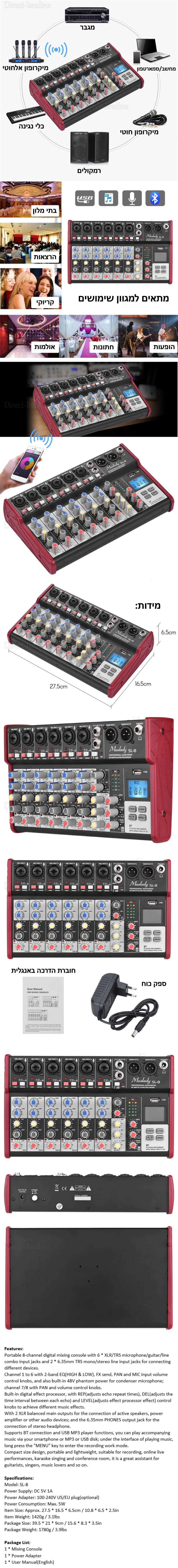מיקסר 8 ערוצים מקצועי לתקליטנים 48V SL-8 Mixer 2-band EQ Built-in 48V Phantom Supports BT USB MP3